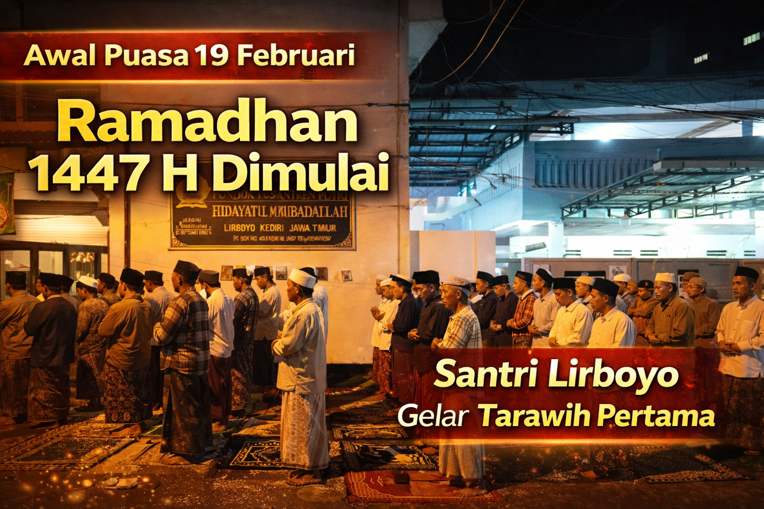 Pemerintah menetapkan 1 Ramadhan 1447 Hijriah jatuh pada Kamis, 19 Februari 2026. Menjelang penetapan tersebut, sejumlah santri Pondok Pesantren Lirboyo, Kota Kediri, Jawa Timur, melaksanakan Shalat Tarawih pertama pada Rabu malam (18/2).