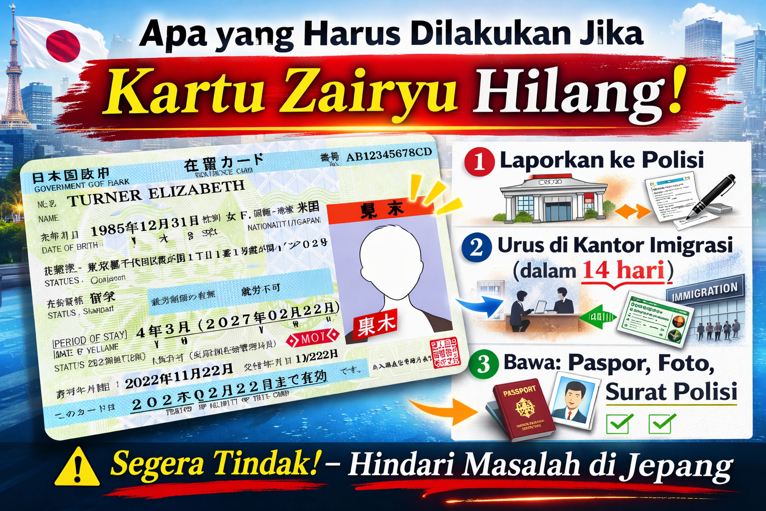 Jika kartu zairyu hilang, Anda harus segera melapor ke kantor polisi dan mengurus penggantian di kantor imigrasi. Kartu ini adalah dokumen penting selama tinggal di Jepang.