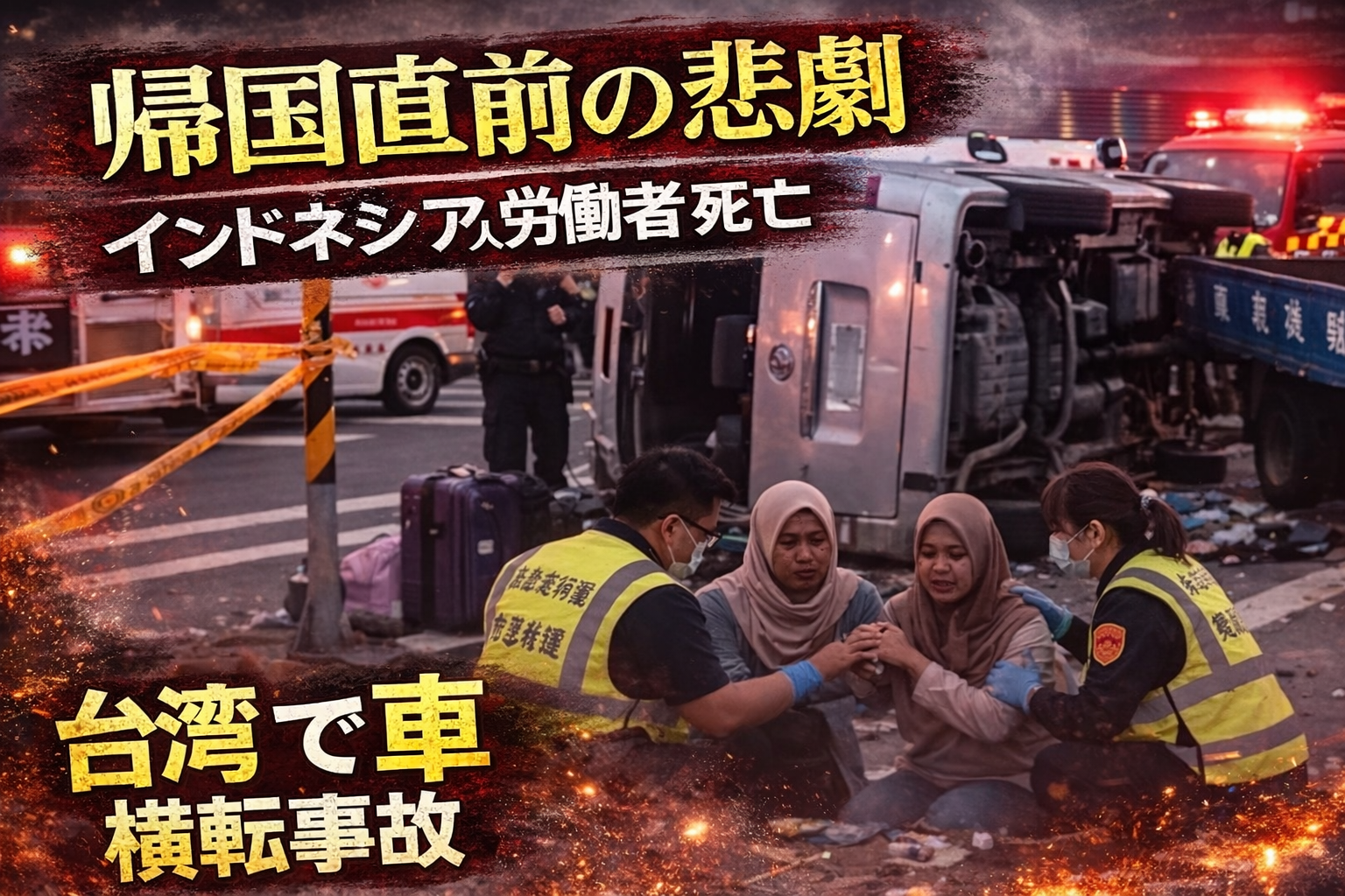 台湾・南投県草屯の交差点で3月15日未明、インドネシア人労働者(PMI)を乗せた車が横転する重大事故が発生し、50歳の男性が死亡した。事故は空港へ向かう途中に起きており、帰国を目前にした悲劇として大きな衝撃を与えている。